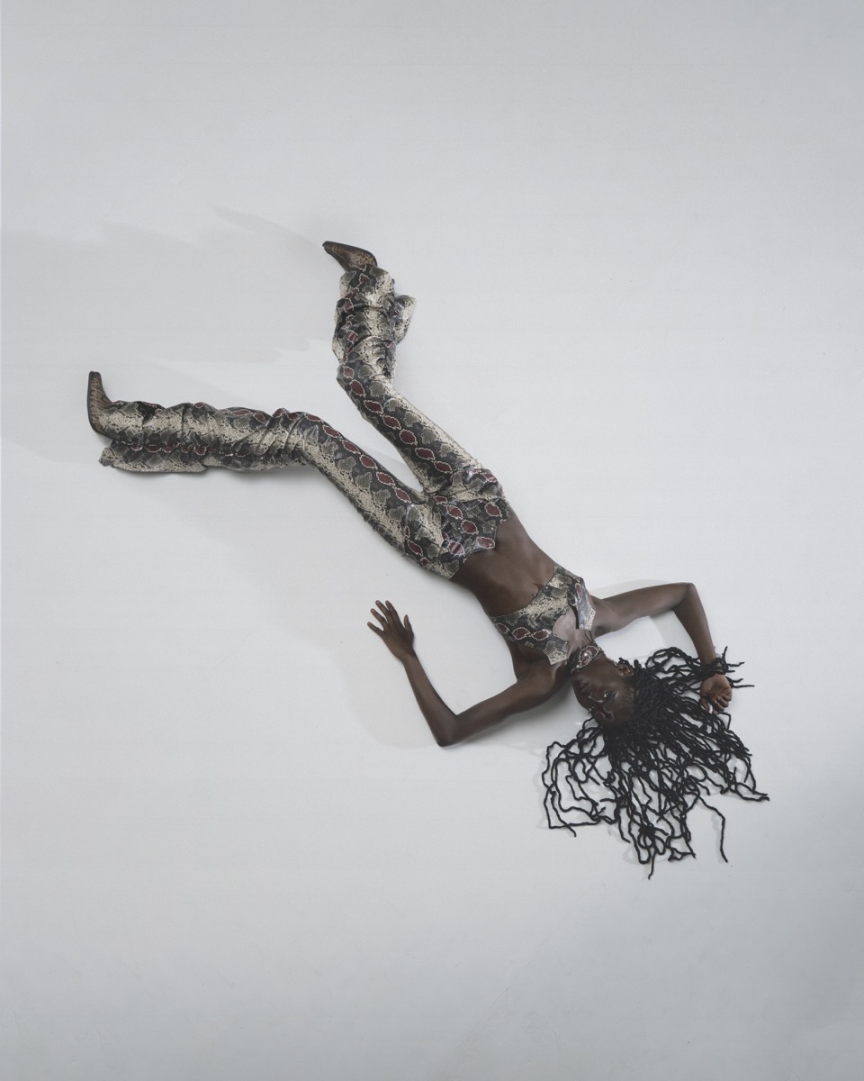 Il pantalone con patchwork a croce celtica è stato realizzato con 3 varianti differenti: denim, eco pelle serpentata e vinile nero.