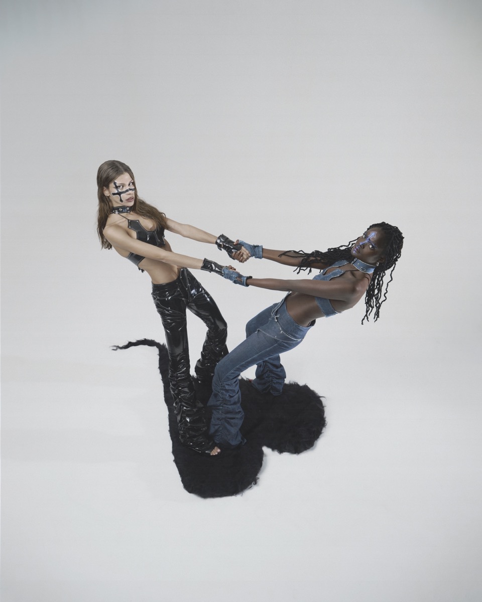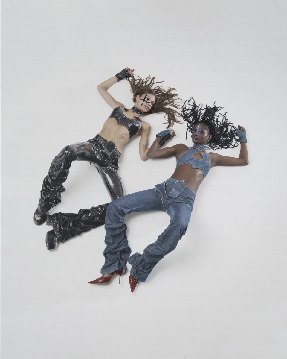 Il drappeggio dona al capo dinamicità e croccantezza. La punta di diamante del pantalone è la patchwork a forma di croce celtica scomposta che agguanta tutta la parte del bacino.